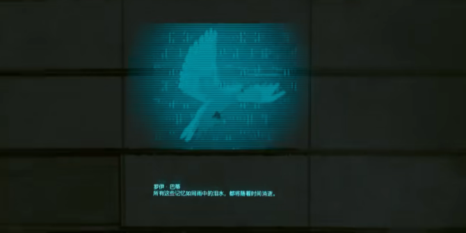 与罗伊·巴蒂互动:靠近NPC时,系统提示“扫描”或“调查”,可获得台词文本:“所有这些时刻终将流失在时光中,如眼泪消失在雨中。”——这正是罗伊在电影中的经典临终独白。