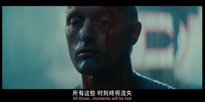 罗伊的台词“所有记忆如雨中泪水消逝”暗示赛博朋克世界中身份与记忆的虚无——无论是人类还是仿生人,最终都无法逃脱命运的消亡。
