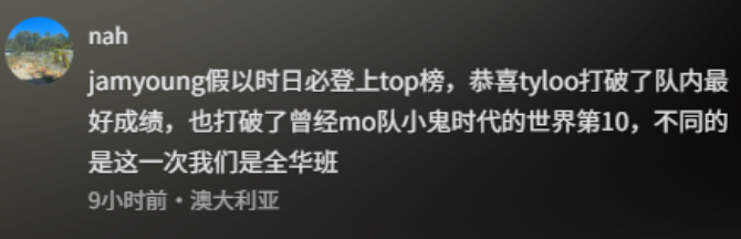 jamyoung假以时日必登上top榜,恭喜tyloo打破了队内最好成绩,也打破了曾经mo队小鬼时代的世界第10,不同的是这一次我们是全华班