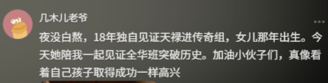 夜没白熬,18年独自见证天禄进传奇组,女儿那年出生。今天她陪我一起见证全华班突破历史。加油小伙子们,真像看着自己孩子取得成功一样高兴