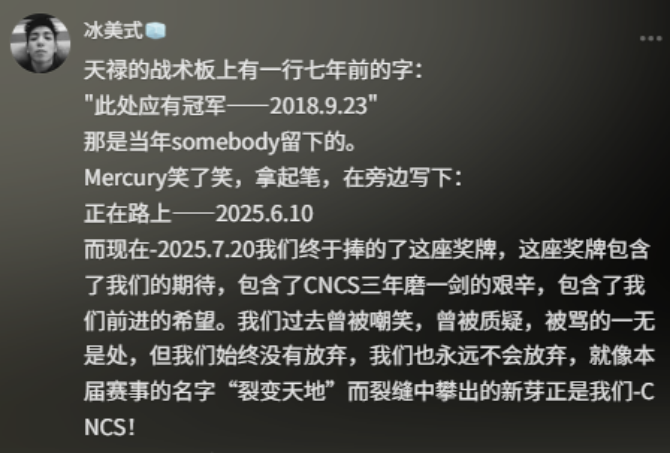 而现在-2025.7.20我们终于捧的了这座奖牌,这座奖牌包含了我们的期待,包含了CNCS三年磨一剑的艰辛,包含了我们前进的希望。