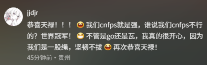 恭喜天禄!!!我们cnfps就是强,谁说我们cnfps不行的?世界冠军!心不管是go还是瓦,我真的很开心,因为我们是一股绳,坚韧不拔 再次恭喜天禄!