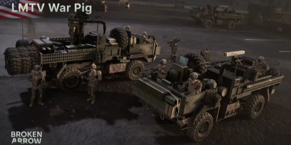 特战队员们戏称为“战争野猪”(war pig)的轻型武装卡车,m1078轻型中型战术车辆的可靠底盘极端轻量化改装的产物,模块化的设计使得其拥有了极大的改装潜力。在游戏中,除了副驾驶的一挺m240通用机枪之外,后车车厢里同样可以安装一门可旋转的武器,m240通用机枪,m2勃朗宁重机枪,激光制导火箭弹,tow2型反坦克导弹的多样化选择使得其确实如野猪一般。此外其还可以搭载高达12人的步兵班组,可以将您的游骑兵和三角洲以95km/h的高速运往前线。