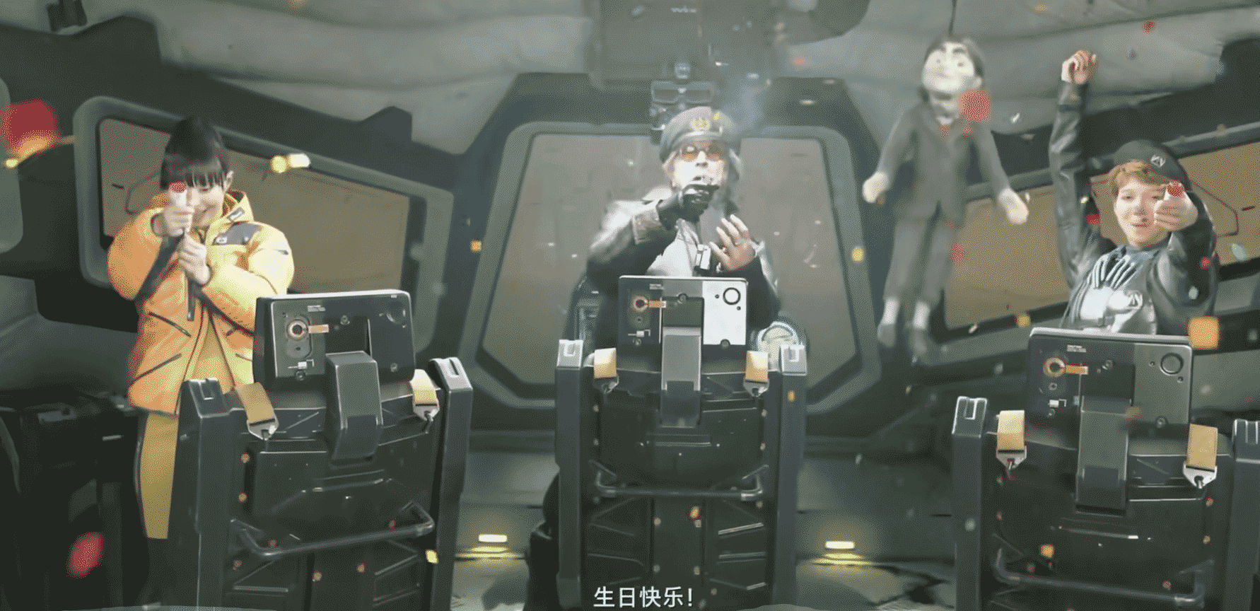 芙拉吉尔、心人、亡人等角色从黑暗中闪现,手持蛋糕与礼物,齐声高喊“生日快乐”!