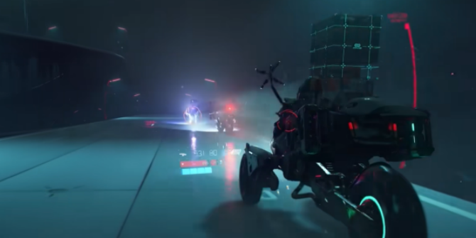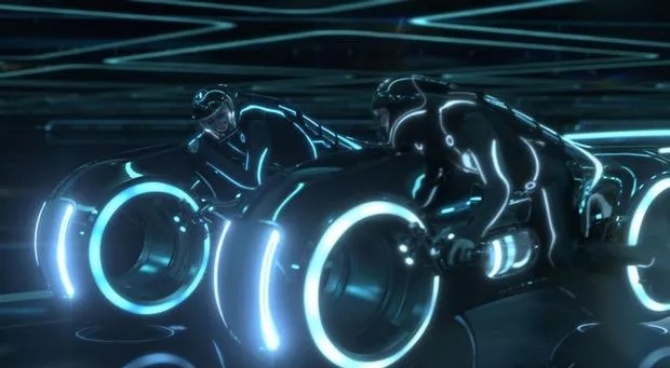而黑夜的游戏场景,机车大战,像是《暴力摩托》,但是漂浮路段和载具的设计以及环境光影则又给我一种科幻片《创:战记》的熟悉感。