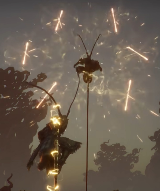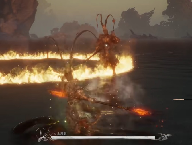 跟大圣对局时,有些天命人会选择金箍棒在地面上画火圈对抗大圣,一开始大圣还回颇有兴致跟你比上一番,谁的火圈画的大。但是要是你跟他比试的多了,大圣会掏出个掏来,直接在那啃。