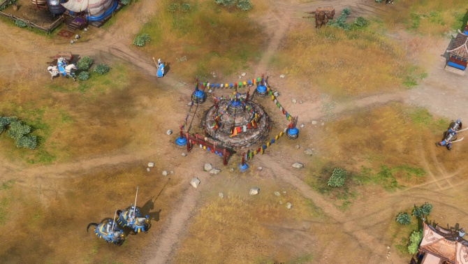 游戏中的蒙古文明拥有极致的机动性,除了敖包之外的建筑都可以打包,单位移动速度普遍较高,擅长快速突袭与转移战场。而经济上,无需建造房屋,完全依赖敖包自动生产石头,并且通过牧场代替农田,以掠夺补充经济。