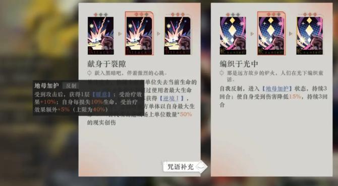在“地母加护”状态下,诺谛卡固定有10%受治疗加成,随着生命值减少,在20%血量以下最多可叠加40%的受治疗效果。