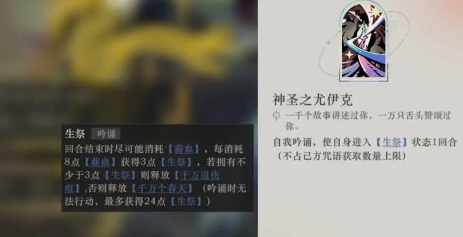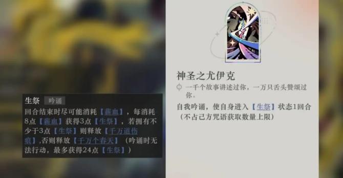 『生祭』: 至终仪式赋予的状态,薪血层数每多一层对应会使信仰层数加一,8层可以释放至终仪式进入『生祭』,根据层数换算释放不同衍生。