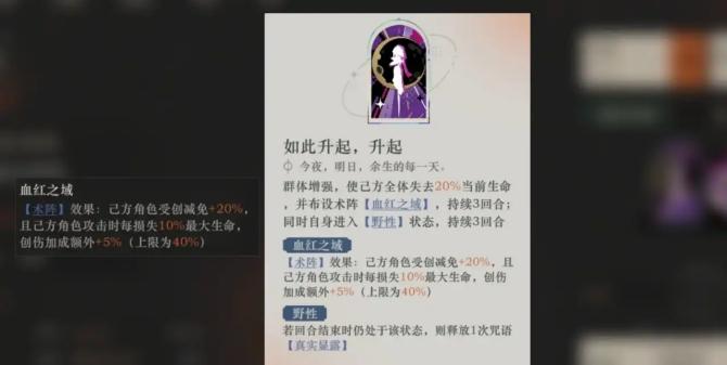 至终仪式衍生的『术阵』可以说是诺谛卡的同款,血量越少增伤越高,完美契合。
