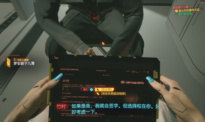 荒坂从未真正承诺治愈V,而赫尔曼的协议也实质上就是利用V仅存的实验价值,无论选择上传或死亡,V都成为公司资本的工具。在结局后,所有玩家都看目标了,所谓“医疗计划”只不过就是荒坂的谎言,赛博世界中公司对人性的彻底漠视体现的淋漓尽致。