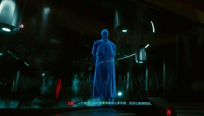 术后V在空间站进行重复性的康复训练,被荒坂公司严密监控着。从医生的对话中,我们能猜出荒坂的真实意图是研究Relic芯片与意识融合背后的秘密。而对V所谓的“康复”治疗实为收集数据,V的身体正逐渐衰败,他的意识却沦为了公司的研究对象。