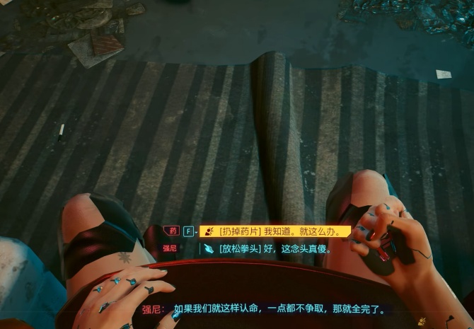 选择【我可以把这一切都抛下】。然后拒绝服用欧米茄阻断剂,并扔掉药片。随后,在夜之城的绚烂霓虹下,一声枪响,V的生命戛然而止。