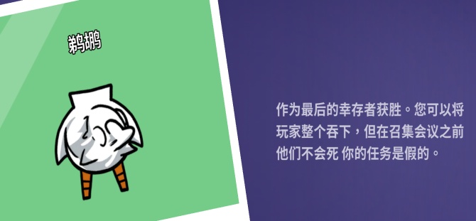 鹈鹕的胜利条件是成为游戏中最后的幸存者,或者等到触发“鹈鹕时刻”,也就是场上剩3个人的时候,无视cd可以吞噬所有人。