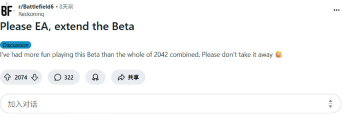 一名粉丝在Reddit上发帖,标题为“EA求你了,延长BETA测试吧”,正文中这名玩家写道:“我玩这个测试版的乐趣比玩《2042》加起来还要多。请别把它带走。”