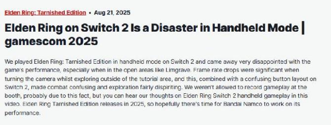最近的科隆展上《艾尔登法环》开放了Switch 2版的试玩,IGN等多家游戏媒体进行试玩后纷纷表示很失望。不仅游玩中出现严重的掉帧和卡顿,优化也是灾难级别的。