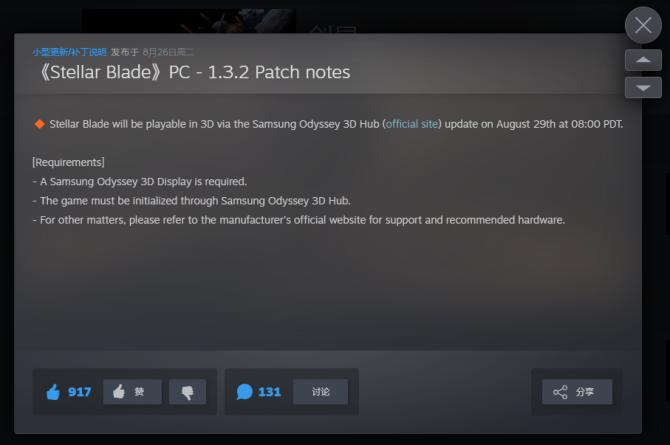 《剑星》于8月26日更新了1.3.2版本,正式支持裸眼3D,但必须要三星的Odyssey 3D显示器才能实现。普通的显示器还用不了这个功能。