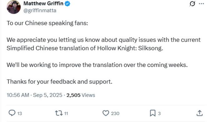 官方承诺:刚发售之初,《丝之歌》蹩脚的古风翻译引得玩家大为不满,部分语句还逻辑不通,篡改原意,可以说是质量很差了。多家评价直指翻译团队,官方Team Cherry看到社区的玩家消息后,承诺将会修改翻译,但具体的时间表和方案还没有公布。