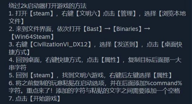 Steam端操作:先打开Steam,右键文明六,点击管理,选浏览本地文件,然后依次打开【Bast】→【Binaries】→【Win64Steam】,右键【CivilizationVI_DX12】创建桌面快捷方式,再按教程修改启动选项就行。