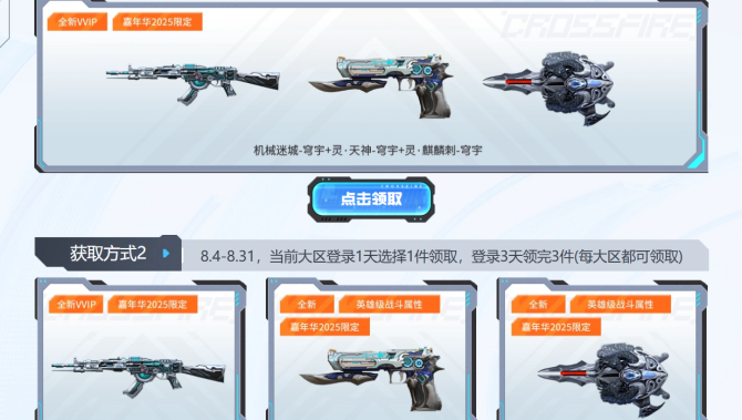 穹宇三件套:VVIP武器白给。8月2-3日登录,直接抱走机械迷城-穹宇、灵·天神-穹宇、灵·麒麟刺-穹宇三件套,全是VVIP级武器!就算错过这两天,8月4-31日累计登录3天也能领全,门槛低到离谱,这波白嫖必须冲!