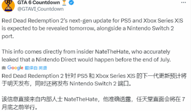 任天堂7月31日晚的直面会,怕是要引爆玩家圈!据靠谱爆料人NateTheHate透露,《荒野大镖客2》很可能要搞个大新闻——Switch 2版本要官宣,连PS5和Xbox的次世代更新也可能一起放出来,这波操作直接把期待值拉满!