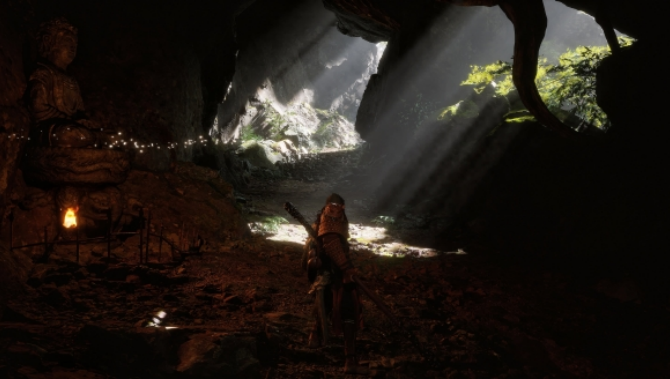 路径追踪:技术力拉满。游戏直接上了全套光线追踪,用路径追踪算法把光照、反射、阴影全算得明明白白。阳光照在金箍棒上的反光会跟着角度变,瀑布的水花折射出彩虹,连山洞里的火把光都会在石壁上留下真实的明暗层次,光线反弹效果比《赛博朋克2077》还细腻!
