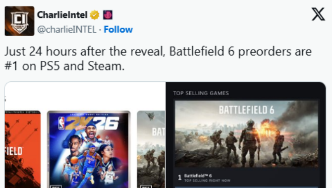 《战地6》这波预售直接炸场!7月31日放出多人模式实机演示后,24小时就冲上PS5和Steam双平台销量榜首,把同期热门游戏全甩在身后,这势头也太猛了!