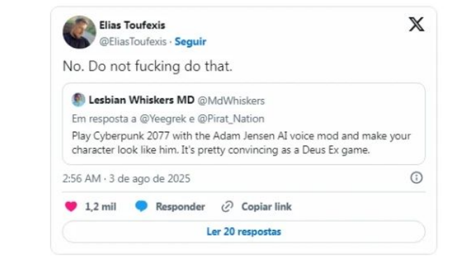 MOD争议:不少玩家觉得把亚当·詹森的声音搬进《赛博朋克2077》挺带感,算是跨圈致敬。但在伊莱亚斯看来,这是对所有创作者的不尊重,配音背后的心血可不是AI随便能替代的。