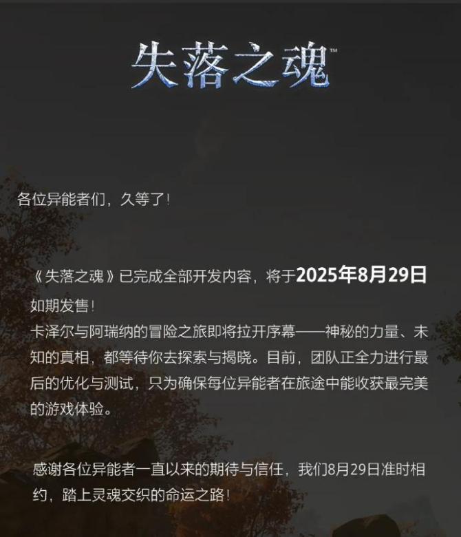 跳票多次,《失落之魂》它终于来了,官方发了公告将在2025年8月29日如期发售,登陆PS5、Steam、Epic游戏商城及WeGame平台。