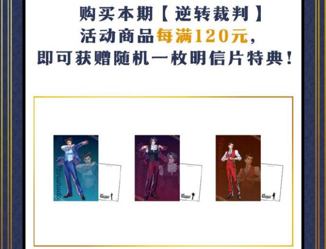 另外购买本期【逆转裁判】活动商品每满120元,即可获赠随机一枚明信片特典哦!