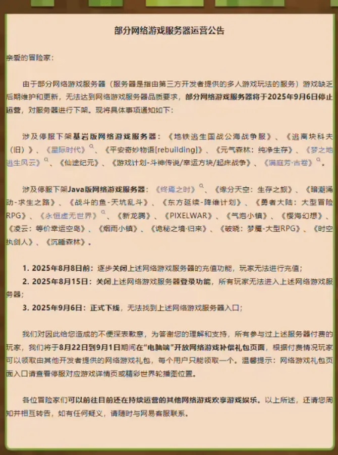 网易《我的世界》这波直接给玩家来了记“回忆杀暴击”!官方宣布,一批因缺乏维护和更新的第三方服务器,9月6日就要彻底凉透——从基岩版到Java版,一堆玩家常逛的“快乐老家”都在名单里,这波下架来得猝不及防!