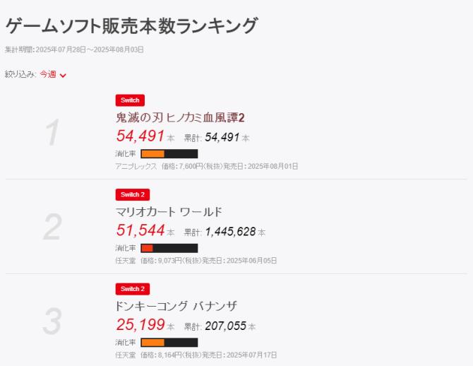 从销量榜来看,在7月28日到8月3日这一周,ns版《鬼灭之刃火之神血风谭2》卖出54491份,超越了《马里奥赛车:世界》3000多份。而紧接着的第三名是前段时间一场火热的ns新作《咚其刚 焦力全开》,销量是25199份。