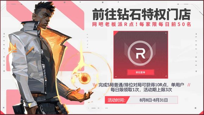 完成5局普通或者排位对局就可以获得10R点,每个用户每日限领取1次,活动期上限3次。注意要在钻石特权的网吧才行哦。