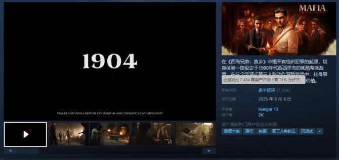 《四海兄弟:故乡》于8月8日发售,现在steam商店好评率已经跌至71%,为多半好评。发售初期的时候,游戏好评率高达83%,是特别好评。而现在下跌主要是由于优化问题和剧情争议等,玩法上也有待改进。