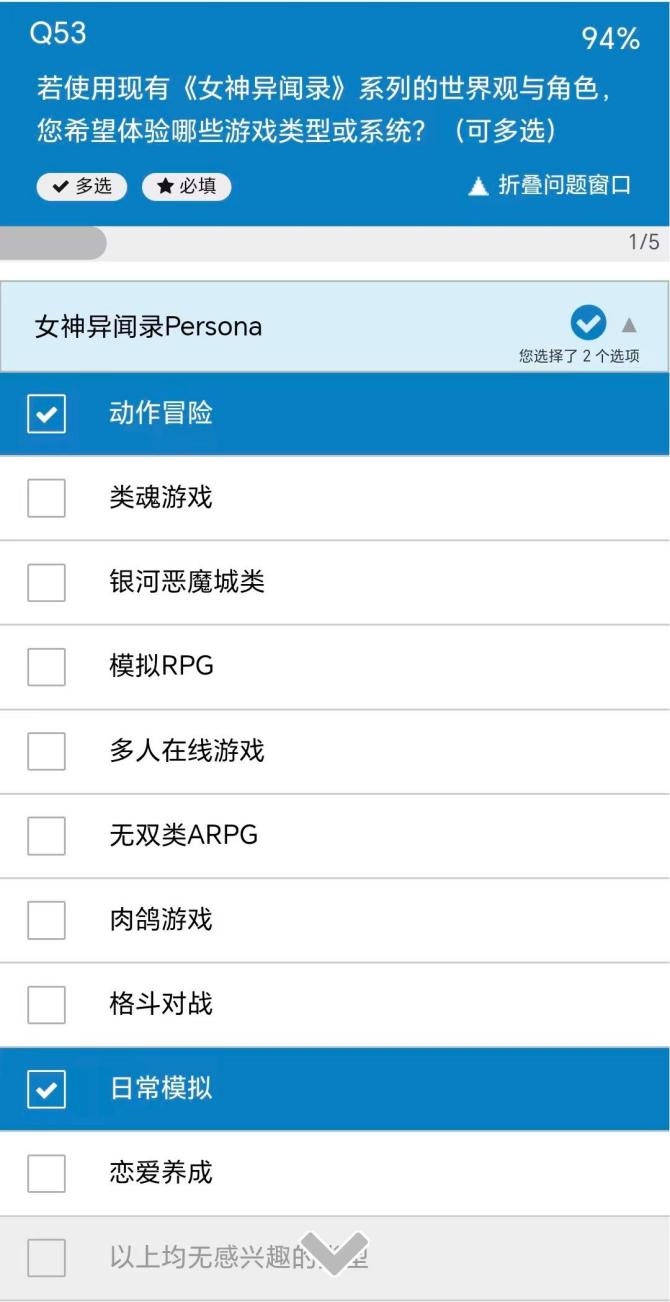 近日ATLUS发表了一年一度的用户调查问卷,问卷中有一项问题很有意思,若使用现有IP的世界观与角色,您希望体验哪些游戏类型或系统?选项也是五花八门,什么类魂、无双ARPG、MMO都端上来了。主要还是针对《女神异闻录》、《真女神转生》、《暗喻幻想》系列。