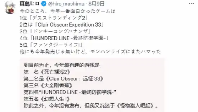 隐藏彩蛋:真岛浩特别提到,虽然不是今年新游,但《怪物猎人:崛起》最近让他重新上瘾,刷起来就停不下来。看来经典神作的魅力就是持久,不管过多久都能让人肝到忘记时间!