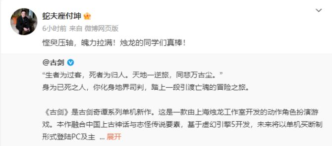 昨天,古剑奇谭系列的最新作《古剑》发布了宣传PV,一天不到火遍全网。而今天,国产3A游戏《湮灭之潮》的制作人在微博转发PV并称赞了称赞《古剑》团队,“悭臾压轴,魄力拉满!烛龙的同学们真棒!”同为3A动作游戏,高度认可了烛龙团队的动画魄力与制作水准。