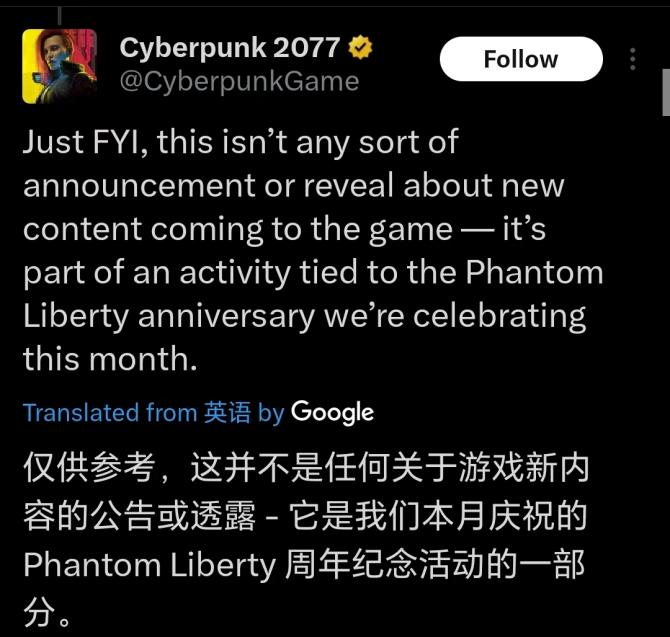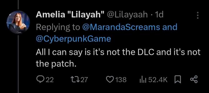 澄清:她没有透露过多的消息,只是针对更新的疑问回答了:可以肯定的是,《赛博朋克2077》9月4日的新消息将不会是DLC或新补丁