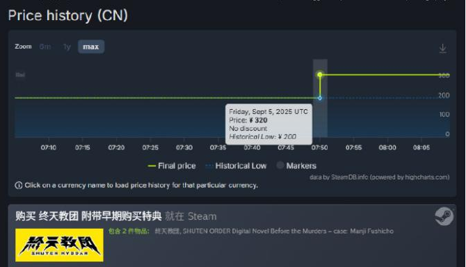 《终天教团》于9月5日正式发售,而仅仅才过了50分钟,标准版的售价就从200元涨到了320元。同时游戏还增加了数字豪华版,售价387元。这次涨价来的猝不及防,引发了玩家们的热议。