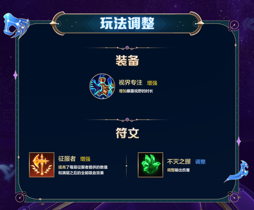 符文改动是重头戏。征服者每层加的攻击力和法强都提高了,满层全能吸血近战涨到 9%,远程还是 5%,战士和射手狂喜!不灭之握就有点惨,额外伤害从 3% 最大生命值降到 2%,坦克们输出要少点了。