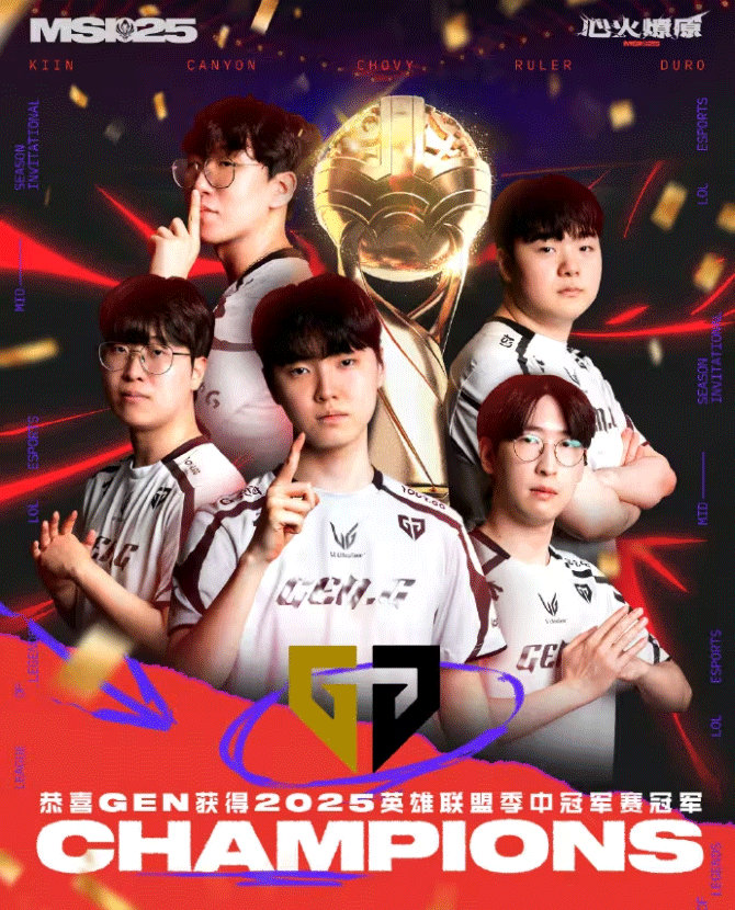 兄弟们,2025MSI决赛直接封神!GEN和T1打满五局,最终GEN顶住压力3:2掀翻T1,成功卫冕冠军!这波操作直接让LCK内战变成“世纪大战”,全网电竞迷集体沸腾!