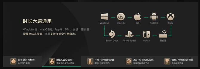 四端通用:一个账号支持电脑、手机、主机(PS/Xbox/Switch)、路由器同步加速;