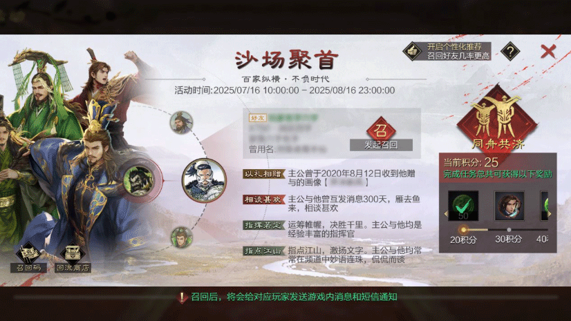 参与条件:2025年6月16日10点前开启的S1服务器,征服赛季服务器,备战区开启此活动。2025年7月1日10点前创建的青春服角色且历史势力值≥2000,可在活动界面发出召回邀请或生成召回码分享给满足本次回归条件的主公 。经典服和青春服角色之间不能相互召回。