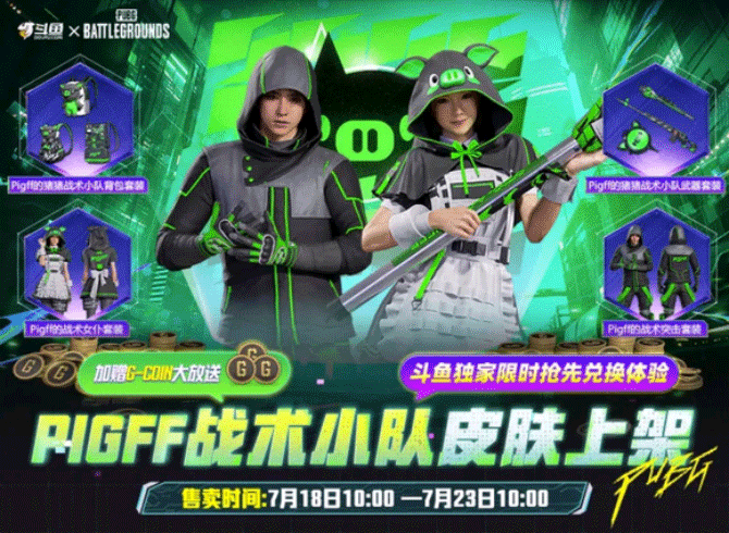 2025年7月17日,《绝地求生》(PUBG)正式推出与斗鱼主播Pigff(马玺鉴)的联动皮肤,涵盖武器、服饰及专属道具,活动持续至8月底。