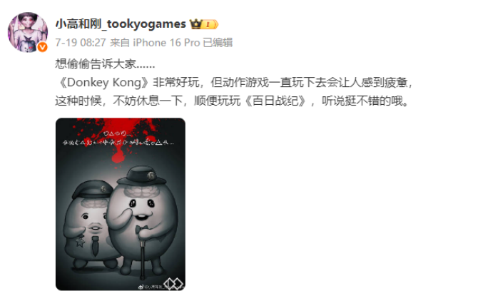 《百日战纪》制作人小高和刚更是在微博调侃”《咚奇刚:焦力全开》非常好玩,但是玩久了也会疲惫,不妨也来玩一玩《百日战纪》。“