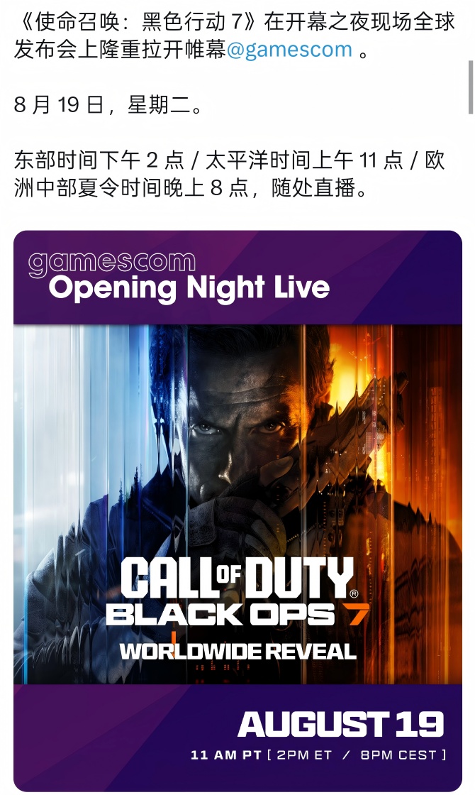 这场备受瞩目的新作首秀将于北京时间8月20日凌晨2:00揭开面纱,届时将通过各大游戏直播平台实现全球同步放送。《使命召唤》官方紧随其后发布的预热动图中,闪现着破碎的全息地图与闪烁的战术仪表盘,配合 “倒计时已启动” 的文案,进一步强化了2035年近未来战场的科技感。