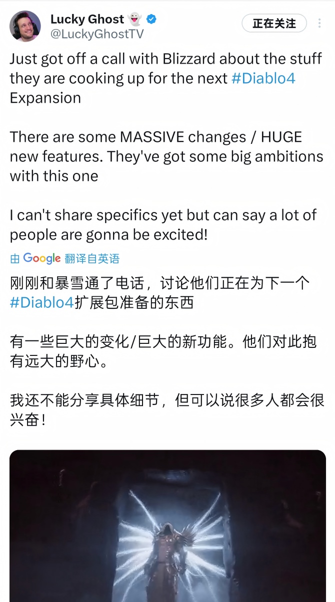 此外,暴雪首次向外界展示了明年才会推出的新资料片。根据知名游戏主播Lucky Ghost透露:“刚结束与暴雪的通话,他们正在为《暗黑4》资料片筹备一些革命性改动/重磅新功能。这次他们野心勃勃,虽然不能透露细节,但绝对会让很多人疯狂!”