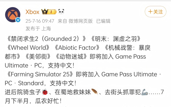 根据微软XBox官方微博官宣的消息来看,七月下旬将会有众多游戏加入XGP的服务中,且都支持中文。