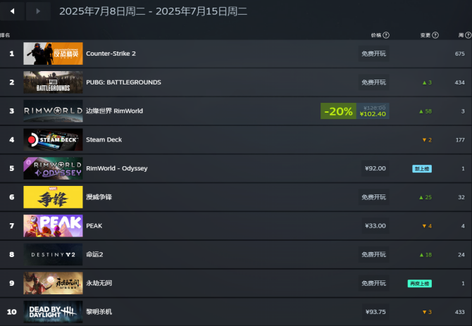 Steam 最新一周(7.8 - 7.15)销量排行:多款热门游戏霸榜
