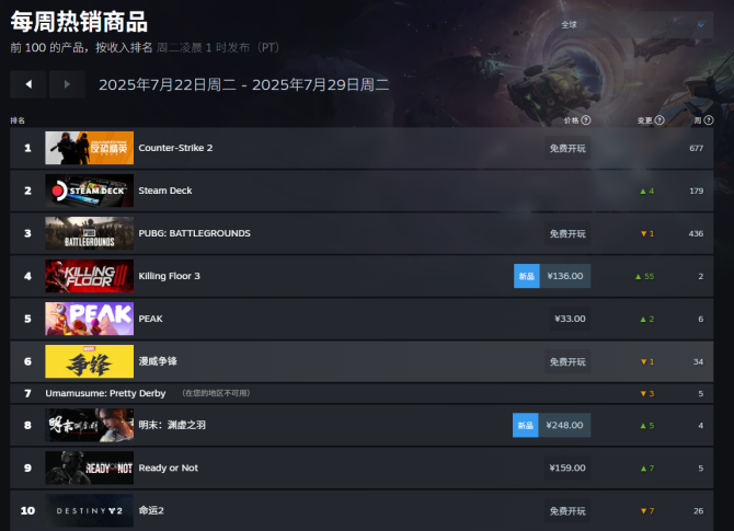 Steam每周二更新的全球热销榜(按收入排)里,7月22日 - 29日这一周的战况特别有意思——免费游戏霸着顶流,掌机突然杀疯,还有两款新游直接“空降”前十。咱挨个扒一扒这些排名背后的门道: